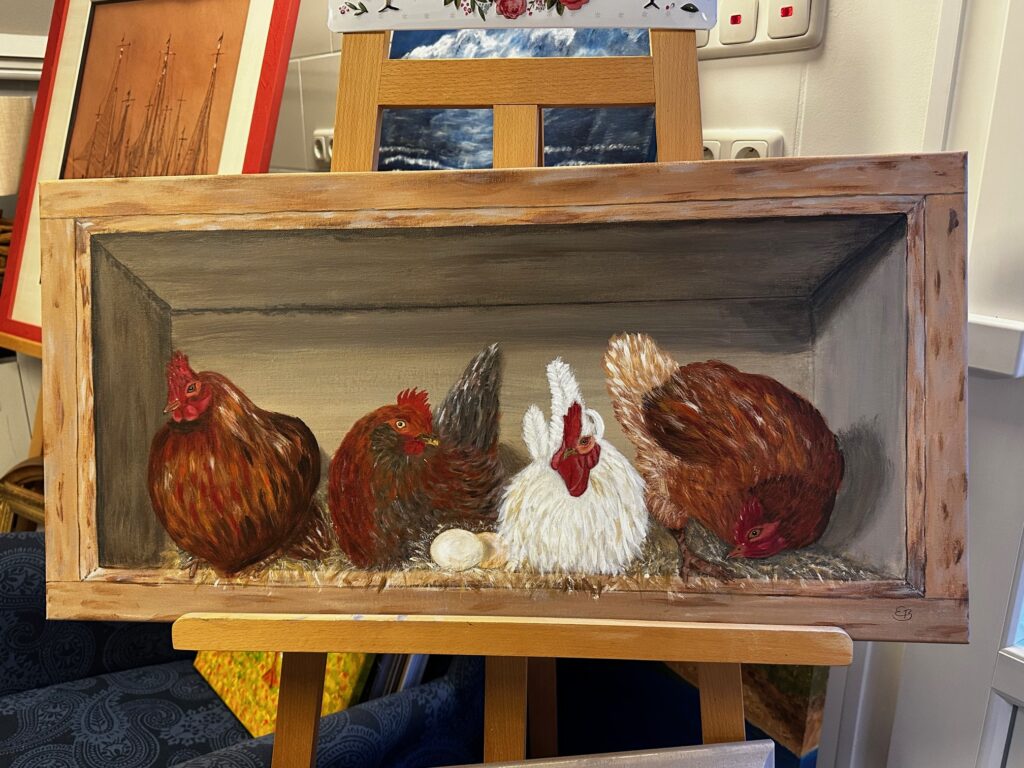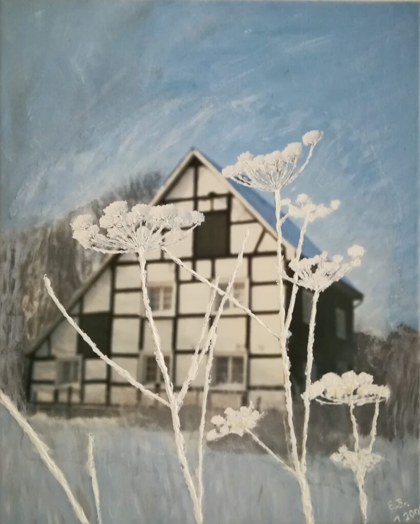 Bergisches FachwerkhausStrandspaziergang 60 x 60 cmAusternfischer 24 x 30 cm mit HolzrahmenSeeschwalbe 30 x 30 cmSeehund 60 x 60 cmKundenauftrag Hühnerstall 40 x 80 cm