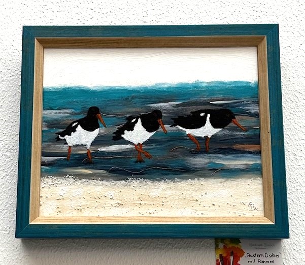 Meerbild mit Möwen 50 x 70 cmBadetag 50 x 70 cm Gewitterstimmung am Deich 40 x 50 cm mit hochwertigem blau/sandfarbenem RahmenZiegenbrettGänsebrettMeer geht immer 60 x 60 cm